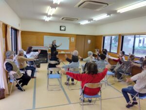 椅子に座った状態での軽い体操を行い、その後は手作りのけん玉作りも一緒に行いました。