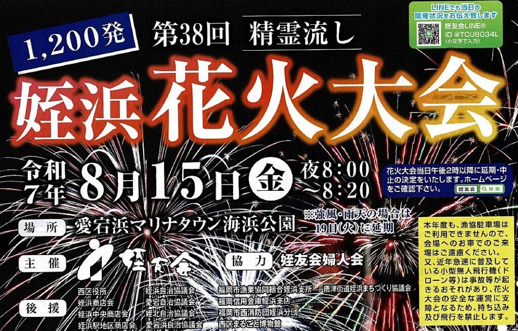 8月15日の夜8時から毎年恒例の『姪浜精霊流し花火大会』が開催されます‼